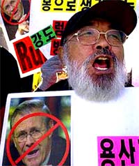 In protests surrounding Rumsfeld's visit, activists denounced what they call Washington's pressure tactics and demanded President Roh reverse his troop decision.