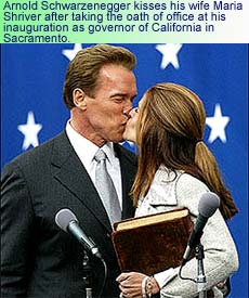 Schwarzenegger's wife, Maria Shriver, held the Bible while California Supreme Court Chief Justice Ronald George administered the oath of office at the ceremony. Speaking with his Austrian accent and with his right hand up in the air, Schwarzenegger was inaugurated.