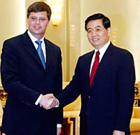 Hu also expressed satisfaction with the political and economic cooperation between the two countries. "Different social conditions put no barrier to bilateral exchanges and cooperation," he said.