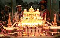 The miniature Grand Fountain, which is 1/38 of the original in size, is composed of three buildings and constitutes the focal part of Yuanmingyuan's 13 scenic spots. The magnificent recreation is made of gold, diamond, jade, sapphire, pearl, which took dozens of skilled craftsmen over five years to complete it at a cost of over 23 million yuan.