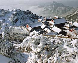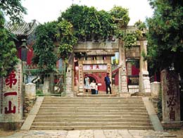 Taishan Temple at the foot of the mountain is one of several major palace architectural complexes in China. The Azure Clouds Temple near the top of the mountain is another grand building complex, a special combination of metal components, wood, and bricks and stone structures. From the Taishan Temple to the Azure Clouds Temple there are numerous stone tablets and inscriptions and ancient buildings on the way. Visitors derive much pleasure from climbing Mount Taishan. From the red gate at the foot of the mountain to the South Heaven Gate at the top are some 7,000 stone steps, which wind their way up the mountain slopes, each step offering a different view.