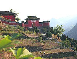 The most distinguishing feature of Mount Wudang is the large Taoist architectural complex. Making full use of the terrain featuring towering mountains and deep valleys, more than 20,000 rooms were built in spots where they most harmoniously blended with the nearby woods, rocks and streams so that the man-built structures and natural elements complimented each other. The Gold Hall, built in 1416 on the top of the Heavenly Pillar Peak, is the largest copper structure existing in the country. It is 5.54 meters tall and 5.8 meters wide. The walls were cast separately, but precisely and well knit. All the statues of god and sacrificial vessels are made of copper. Although 500 years have past, they still glitter as before.
