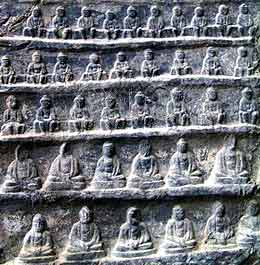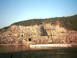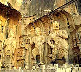 The Longmen Grottoes, located near Luoyang, Henan Province, are a treasure house of ancient Buddhist cave art. The grottos were hewed and carved during the Northern Wei Dynasty (386-534), when the rulers relocated their capital at Luoyang near the end of the 5th century. At that time Buddhism was spreading east into China and was venerated by the imperial court. The Buddhists adopted the practice of carving rock temples, dedicated to the Buddha.