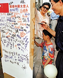 The Hong Kong Federation of Trade Union (FTU) held the campaignon Oct. 8- 9 in its 10 district offices to collect Hong Kong residents' signatures to show local residents support and good will for the motherland's first manned space flight.
