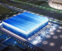 A semi-transparent "cube", with "bubbles" spread out all over its surface, is a shape very similar to the structure of "H2O", the outlook for the National Swimming Center at the 2008 Olympic Games. After the games, it will become a recreational water park open to the public.
