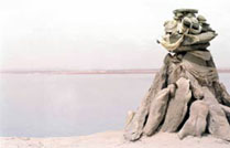 Scattered about the caves and on the bank of the salty lake area large number of rusty scraps, pipes of various diameters and strangely shaped stones. Some of the pipes run into the lake.
