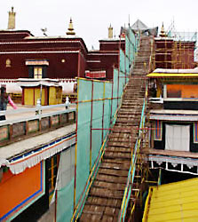 In Tibet today the skyline of golden roofed monasteries are intermingled with structures of a different kind. A spider web of scaffolding has appeared around many of the region's older buildings as operation face-lift gets into full swing and renovation returns the important historical structures here back to their former glory.