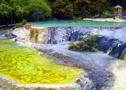 The calcium carbonate, in turn, develops into solid, low travertine banks and reacts chemically with organic and inorganic substances, resulting in various kinds of calcareous deposits that reflect a golden color in the sunlight in the water that flows down the slopes just like a huge yellow dragon flying down the snow mountain.