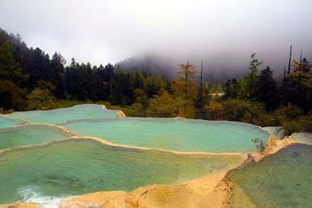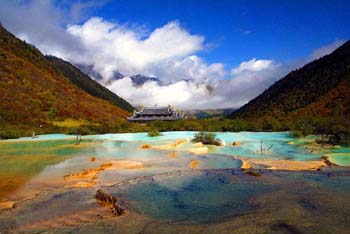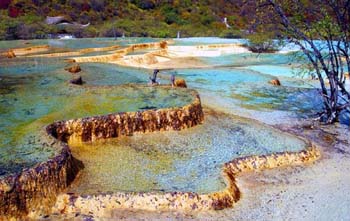 Huanglong (Yellow Dragon) Scenic Area, also in northern Sichuan's Aba Tibetan and Qiang Autonomous Prefecture, neighbors the Jiuzhaigou Scenic Area. It was named after the ancient Huanglong Temple within the area.