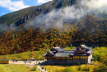 The Huanglong Temple is situated on the top of the scenic area. South of the temple is Xuebaoding, the main peak of the snow-capped Minshan Mountain. Rising 5,588 meters above sea level, it is covered in snow all year round.