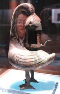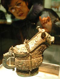A local resident views an ancient wine container dating back to ancient China's Shang Dynasty (1,600 BC-1,100 BC) in the newly-built Shanxi Museum in Taiyuan, capital of north China's Shanxi Province, Jan. 8, 2005.