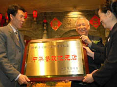 Zhang Shiyao (C), president of the Chinese Cuisine Association, awards a brand to Beijing Qianmen Quanjude Roast Duck Restaurant for its excellent achievements in the management Nov. 26, 2002.