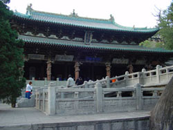 The ancient group structures of the Shrine fall into three parts: north, south and middle. The middle, which is regarded as the main portion, has a high artistic value starting from the Water Mirror Platform and across respectively, the Immortal-gathering Bridge, the Jinren (Gold Figure) Platform, Duiyue Mill, the Sacrificial Hall, Bell Tower and Drum Tower, Yuzhao Feiliang (a flying bridge over a stream with fishes) to the Hall of Goddess. The northern part rises from Weichang Palace to Dongyue (East Mountain) Temple, the Temple for Guangong, Sanqing Temple, Baohan Pavilion in the period of Emperor Zhenguan, the Temple of Shuyu (another name for Ji Yu), Chaoyang (Facing the Sun) Cave, Daifeng Xuan (a small room or veranda with windows), Santai Pavilion and Reading Platform, The Luzu Temple, which were characterized by layers upon layers of towers and high pavilions rising and falling naturally by the terrain, picturesquely in disorder.