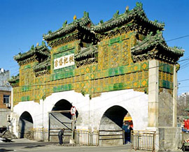 On the south side of Chaoyangmenwai of the temple gate stands a magnificent green-and-yellow glazed arch of four columns. Erected in 1607, the gate is comprised of three arches and is now the only remaining color-glazed arch in Beijing.