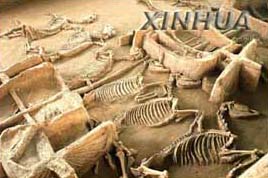 Believed to date to the Eastern Zhou Dynasty (770 B.C.- 256 B.C.), the pit contains six clay horses and one chariot, a form echoing ancient records that the earliest Chinese emperors rode in chariots pulled by six fine horses.