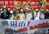 Tourists from the Republic of Korea (ROK) arriving at the Beijing International Airport send a scroll to staff members of the Beijing Municipal Government and the Beijing Municipal Tourism Bureau at the airport June 30, congratulating Beijing for its victory in fighting against SARS.