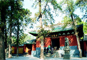 Known worldwide as the cradle of Chinese martial arts, Shaolin Monastery is 80 kilometers southeast of Luoyang at the western edge of Songshan, the central of China's four sacred Taoist peaks. It can be reached in 3 hours on a country road through farming villages. The fame has brought change and it is far from a remote and romantic retreat where the wisdom of the ages is passed from master to novice. It is now a major tourist area, as well as a place of pilgrimage for monks and lay Buddhists. A training hall has been built next to the monastery for the many foreign enthusiasts that come to study. The founder of the monastery was the Indian monk Bodhidharma, where he reportedly sat facing the back wall of a cave and meditated for nine years. His silhouette is said to have been imprinted on the rock. Imperial sanctions ensured the growth of Shaolin's reputation as a martial arts center.