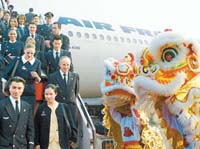 Chinese athletes perform a lion dance to celebrate the arrival of the first direct flight from Paris by Air France in Guangzhou on Tuesday.
