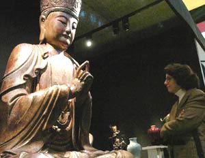 An exhibition featuring Ancient arts of Asia was held in New York, March 30, 2004. Of more than a thousand treasures of art on display, some one third came from China. This picture shows a  Chinese Buddha statue of the early 11th century.