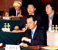 Chinese State Councilor Tang Jiaxuan meets six-party talks delegates in Beijing on August 29, 2003.