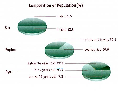 China is the most populous country in the world, with 1.28453 billion people at the end of 2002, one-fifth of the world’s total. This figure does not include the Chinese living in the Hong Kong and Macao special administrative regions, and TaiwanProvince. Moreover, the population density is high — with 134 people per sq km — and unevenly distributed. Along the densely populated coastal areas in the east, there are more than 400 people per sq km; in the central areas, over 200; and in the sparsely populated plateaus in the west there are less than 10 people per sq km.