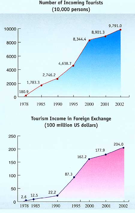 In 2002, tourism income came to 556.6 billion yuan, or an increase of 11.4 percent over that of the previous year, and 3.4 percentage points higher than the overall growth rate of the national economy. Foreign exchange earnings generated by tourism reached 20.4 billion US dollars, or a raise of 14.6 percent over 2001. Outbound tourism—Chinese citizens traveling to other countries—also grew. In 2002, a total of 16.6 million Chinese people traveled abroad, an increase of 36.8 percent over that of the previous year. Domestic tourism has been growing in a sustained way, and both tourists and tourism earnings grew by more than 10 percent over those of the previous year.