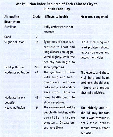 In regard to indoor pollution — cited in a 2002 World Health Organization report as one of the 10 major health threats worldwide -- China in 2003 issued its first regulation on standards for indoor air quality by establishing a ceiling for 13 chemical pollutants including formaldehyde, benzene, ammonia and several harmful particulate matters.