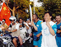 Jackie Chan a été l'un des autres coureurs chinois participant avec Sun Wen et Pu Cunxi à la transmission de la flamme olympique. Le 23 juillet à 19 h 45 m, la course de relais pour transmettre la flamme olympique a pris fin. ? Je suis très heureux d'avoir la chance de participer à la course de relais pour transmettre la flamme olympique au nom de plus d'un milliard de Chinois. Cette soirée est un des moments inoubliables de ma vie. ? a déclaré Jackie Chan.