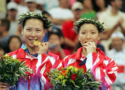 Les Chinoises Yang Wei et Zhang Jiewen ont remporté le 21 ao?t la médaille d'or du double dames du tournoi de badminton des Jeux Olympiques d'Athènes, et la médaille d'argent est également décrochée par les Chinoises Gao Ling et Huang Sui. Les Sud-Coréennes Lee Kyung Won et Ra Kyung Min ont remporté la médaille de bronze.