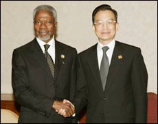 Au cours d'une réunion avec le secrétaire général des Nations unies Kofi Annan, M. Wen a noté que, sous la direction de M. Annan, l'organisation mondiale avait fourni une réaction rapide et énergique à la catastrophe, une réaction vivement appréciée par le gouvernement chinois.