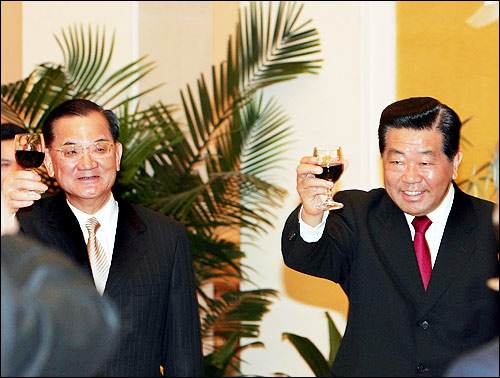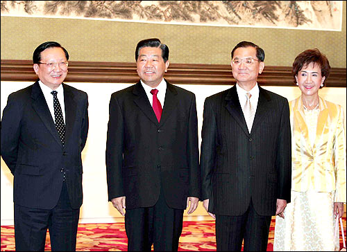 Lors de la rencontre, Jia a exprimé ses souhaits de bienvenue au président du KMT Lien Chan pour sa visite sur la partie continentale de la Chine à la tête de la délégation.