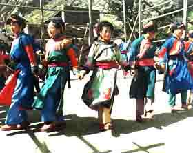 Danse d'armure. Cette danse rituelle exécutée à l'occasion de funérailles présente la solennité et la virilité. Un certain nombre de jeunes hommes jouent des guerriers antiques en portant une armure en cuire de b?uf et un casque à plumes de faisan et à brins de queue de yack. Ils font lentement le tour de l'endroit, tenant haut un couteau, imitant le tir de fusil et poussant de temps à autres des cris ? ao-ya !, ao-wu !?. En créant une ambiance sévère, on vise à exorciser les démons et protéger le défunt. Après plus tours de l'endroit, les guerriers changent plusieurs fois la formation du défilé et se combattent, pour représenter le courage des guerriers antiques.