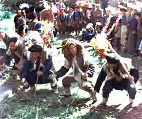 Danse du tambour en cuir de mouton. C'est la principale danse sorcière des Qiang. Selon les m?urs des Qiang, quand un membre de famille tombe malade et à l'occasion des funérailles, la famille invite des sorciers à exécuter la danse du tambour en cuir de mouton. Celui-ci est un objet rituel, un instrument d'accompagnement et un décor de danse indispensable du sorcier. En général, on invite au moins deux sorciers, parfois sept ou huit, qui dansent en même temps. Les rythmes de tambour sont complexes. On dit qu'il y en a 108 sortes. Les sons de tambour s'accélèrent. Les sorciers tapent le tambour en s'accroupissant, sautant et se tournant et en récitant sans cesse des mots d'exorcisation et des textes rituels.
