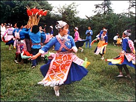 Tra?ner le mouton. De jeunes hommes jouent de la Lusheng en dansant. Les filles qui les suivent. Si l'une d'entre elle trouve un gar?on qui lui pla?t, elle attache un joli ruban qu'elle a tissé autour de ses reins, puis le suit en tirant un bout du ruban et en piétinant avec le rythme. Un bon joueur de Lusheng peut être suivi en même temps de plusieurs jeunes filles. Dans ce cas, le gar?on ne peut, bien s?r, désigner tout de suite sa bien aimée.