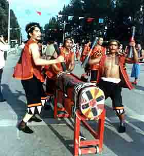 La troisième, ? Battre le Tambour de bois ?, est réservée aux hommes. Une ou deux personnes battent d'abord le tambour et changent de rythme selon le contenu de la danse. Ensuite, trois ou quatre hommes forts s'ajoutent, battent le tambour avec des baquettes peintes en couleurs, sautent et tournent autour du tambour.