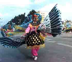 La forme traditionnelle de la danse de paon revête la nature religieuse que les Dai, adeptes du bouddhisme hinayana, exercent certainement à l'occasion des fêtes bouddhistes et du nouvel an. Des hommes, au nombre d'un, deux ou trois, drapés de fausses plumes de paon, portant une casque dorée et une masque, imitent le paon qui se promène dans la forêt, cherche de l'eau, s'ébat au bord d'un ruisseau, se baigne, fait la roue, déploie les ailes sous le soleil et s'envole. La danse est accompagnée aux instruments de percussion comme tambour de ? patte d'éléphant ?, tam-tam, et cymbale.