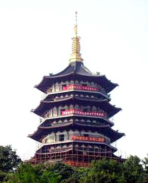 D'autre part, elle est connue aussi gr?ce ? Lu Xun, grand ?crivain et porte-drapeau de la Nouvelle Culture qui a ?crit un texte c?l?bre ? De l'effondrement de la Pagode Leifeng ? dans lequel il a d?crit les charmes de cet ?difice typique. En effet, la pagode endommag?e sous la dynastie des Ming (1368-1644) restait longtemps en ?tat lamentable et depuis son ?croulement en 1924, il ne l?guait que la portique comm?morative sur les ruines.