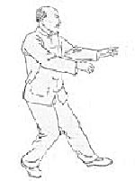 Au moment d?expirer, faire doucement un demi-pas vers l?avant avec le pied gauche, tourner le corps l?g?rement ? gauche avec la taille comme pivot, d?ployer le bras gauche vers l?arri?re avec le coude l?g?rement fl?chi. En m?me temps, fl?chir le genou droit, agiter le bras gauche vers le bas en avant, le bras pendant, poser le centre de gravit? sur la jambe droite. Au moment d?inspirer, tourner l?g?rement le corps ? droite, d?placer le centre de gravit? sur la jambe gauche, placer le pied droit ? c?t? du pied gauche.