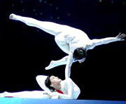 L'acrobatie est une tradition chinoise spectaculaire très ancienne, un art de l'adresse sans parole. Les spectacles d'acrobatie sont une actualisation artistique de la force et de la sagesse de l'humanité. L'acrobatie chinoise a une histoire deux fois millénaire qui a commencé, à l'origine, par des luttes entre deux ou plusieurs personnes coiffées de cornes. Sous les Qin et les Han (221 av. J.-C. - 220 apr. J.-C.), cette lutte occupait une place importante parmi les "Cent jeux". Grace à des perfectionnements, des renouveaux, des inventions et un développement de longue durée, l'acrobatie chinoise actuelle contient non seulement tous les éléments classiques essentiels mais aussi les quintessences d'autres arts, de même qu'elle intègre la gymnastique, le culturisme, la musique, la danse, les sons, la lumière et les décors. Cet éclectisme pla?t au monde entier.
