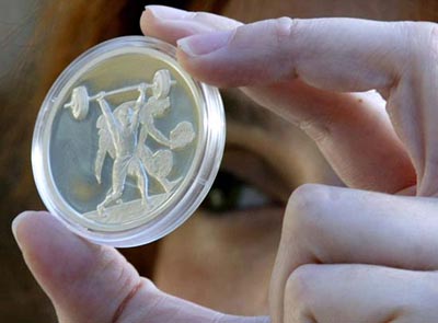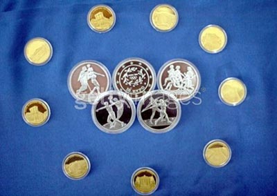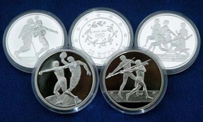 Pièces commémoratives des Jeux Olympiques d'Athènes, en présentation à Berlin le 11 novembre 2003. Le jeu est composé de 12 médailles Grecques en argent et de 6 en or, illustrant 12 sports Olympiques et l'Acropolis.