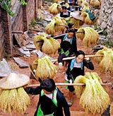 Seit jeher bauen die Basha ihre Reisspeicher gern in die N?he ihrer D?rfer, um sie vor Feuer zu schützen. Vor der Einlagerung muss der Reis allerdings getrocknet werden. Zu diesem Zweck werden die Reis?hren über eine Art St?nder geh?ngt. Die St?nder stehen an Stra?en, an Bergh?ngen und überall dort, wo das Getreide viel Sonne bekommt und so getrocknet wird. Aufgeh?ngt werden die ?hren nach der Herbsternte. Besucht man Basha in der Zeit zwischen Oktober und Ende November, kann man hier eine einzigartige Landschaft erleben: Die im Sonnenlicht golden gl?nzenden ?hren befinden sich überall, an Stra?en, Wegen und in den Bergh?ngen.