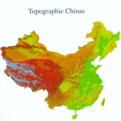 Chinas Topographie ist durch die Bildung des Qinghai-Tibet-Hochplateaus, ein wichtiges geologisches Ereignis auf dem Erdball in Millionen von Jahren, grundlegend beeinflusst. Das Territorium Chinas weist eine Vier-Stufen-Formation auf, die von West nach Ost allm?hlich abf?llt. Das Qinghai-Tibet-Hochplateau ist durch die Kollision der indischen und der eurasischen Festlandplatte entstanden und w?chst noch immer. Mit einer durchschnittlichen H?he von über 4000 Metern über dem Meeresspiegel bildet das Qinghai-Tibet-Hochplateau, das allgemein das "Dach der Welt" genannt wird, die erste der vier Stufen. Der Qomolangma, der Hauptgipfel des Himalaya, ist mit einer H?he von 8848 Metern der h?chste Berg der Welt. Die zweite Stufe bilden das Hochplateau der Inneren Mongolei, das L??plateau, das Yunnan- Guizhou-Plateau, das Tarim-Becken, das Junggar-Becken und das Sichuan-Becken mit einer durchschnittlichen H?he von 1000 bis 2000 Metern. über das Gro?e Hinggan-Gebirge, das Taihang-Gebirge, das Wushan-Gebirge und das Xuefeng-Gebirge hinweg erstreckt sich die dritte Stufe bis zur Meeresküste des Stillen Ozeans. Sie ist bis zu 1000 Meter hoch und umfasst von Nord nach Süd die Nordostchinesische Ebene, die Nordchinesische Ebene und die Ebene am Mittel- und Unterlauf des Yangtse, die von niedrigem Berg- und Hügelland ges?umt sind. Die vierte Stufe ist der Festlandsockel mit einer Wassertiefe bis zu 200 Metern.