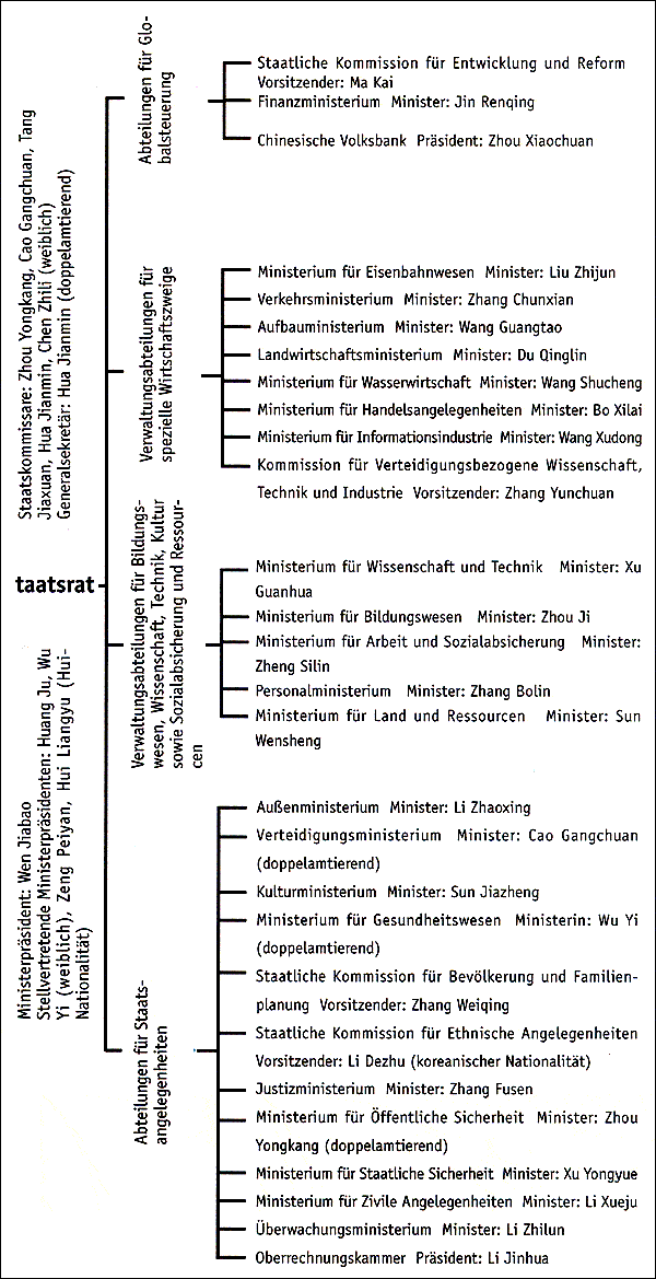 Der Staatsrat besteht aus dem Ministerpr?sidenten, den stell-vertretenden Ministerpr?sidenten, den Staatskommissaren, dem Generalsekret?r, den Ministern, den Vorsitzenden der Kommissionen, dem Pr?sidenten der Chinesischen Volksbank und dem Pr?sidenten der Oberrechnungskammer. Die Abteilungen und Mitglieder des gegenw?rtigen Staatsrats siehe Tabelle auf der folgenden Seite.
