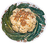 1. Den Blumenkohl in hei?em Wasser blanchieren, abtropfen lassen und mit H?hnerbr?he und Salz in eine tiefe Sch?ssel legen. Die Sch?ssel in einen Bambusd?mpfkorb stellen, so lange d?mpfen, bis der Blumenkohl gar ist und herausnehmen. Den Blumenkohl kreuzweise auf der Oberseite einschneiden und auf einer Platte in seiner urspr?nglichen Form arrangieren.