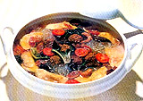 4. Die H?hnerbr?he absch?umen, die Glasnudeln, Pilze, Seegurken, Bambussch?sslinge und den restlicher Porree zugeben und wieder aufkochen lassen. Wenn die Krabben und Pilze zu duften beginnen, werden da restliche Salz und Glutamat sowie Schinken, Fleischb?llchen, Eierkuchen und die Tomaten zusammen zugegeben. Das Sesam?l dar?ber tr?ufeln und den gesamten Topfinhalt in eine Sch?ssel f?llen.