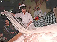 ?Die Zubereitung der feinen Nudeln ist tats?chlich ein Meisterst?ck, das die Zuschauer erstaunt. Besonders magisch ist die Herstellung von Dao-Xiao-Mian-Nudeln und La-Mian-Nudeln. Ein ge?bter Koch kann den Teig mehr als 30 Mal ziehen, bis sich der Teig endlich in Tausende Nudelf?den verwandelt. Der mit Zauberkraft zu Tausenden F?den gezogene Teig sieht dann aus wie Seide. Ohne flei?iges ?ben, mehr als 5 Jahre sind erforderlich, schafft es ein Koch auf keinen Fall, einen Teig zu seidenartigen Nudelf?den zu machen.?