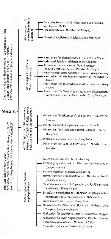 Der Staatsrat besteht aus dem Ministerpr?sidenten, den stellvertretenden Ministerpr?sidenten, den Staatskommissaren, dem Chefsekret?r, den Ministern, den Vorsitzenden der Kommissionen, dem Pr?sidenten der Chinesischen Volksbank und dem Pr?sidenten der Oberrechnungskammer. Die Abteilungen und Mitglieder des gegenw?rtigen Staatsrats siehe Tabelle auf der vorigen Seite.