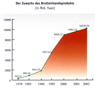 Nach einem planm??igen Wirtschaftsaufbau in gro?em Ausma? ist China heute, nach über 50 Jahren, ein wirtschaftlich starkes Land mit dem gr??ten Entwicklungspotential. Das Leben des Volkes erreichte im Gro?en und Ganzen einen bescheidenen Wohlstand. Von 1953 bis 2000 hat China nacheinander neun Fünfjahrespl?ne erfüllt und ein solides Fundament für die Weiterentwicklung der Volkswirtschaft gelegt. Die dabei erzielten Erfolge erregten in der ganzen Welt gro?es Aufsehen. Die Einführung der Reform- und ?ffnungspolitik seit 1979 hat dazu geführt, dass Chinas Wirtschaft in einem nie da gewesenen Tempo gewachsen ist. Seit dem Eintritt ins 21. Jahrhundert entwickelt sich die chinesische Wirtschaft weiter mit einer st?ndig hohen Geschwindigkeit. Im Jahr 2002 erreichte das Bruttoinlandsprodukt mit einer Wachstumsrate von 8% mehr als 10000 Milliarden Yuan.