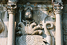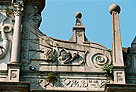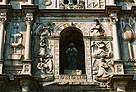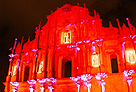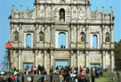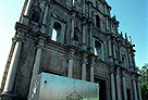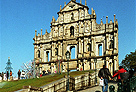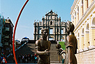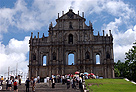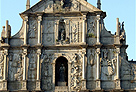大三巴は花崗巖で築造されたもので、もとのサント?パクロ教會堂の正面の壁の遺跡であり、壁全體はバロック風のものであるが、一部の設(shè)計と彫刻ははっきりした東方の色彩を持つもので、例えば、中國語の文字と日本の伝統(tǒng)を象徴する菊の花の丸い図案などがそれである。この中國と西洋の建築物の風格を結(jié)び付けた門のある壁は全世界のカトリック教會堂の中でまたとない存在である。 |