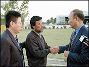 寫真は、イスラマバードに到著した王恩徳さん(中)。